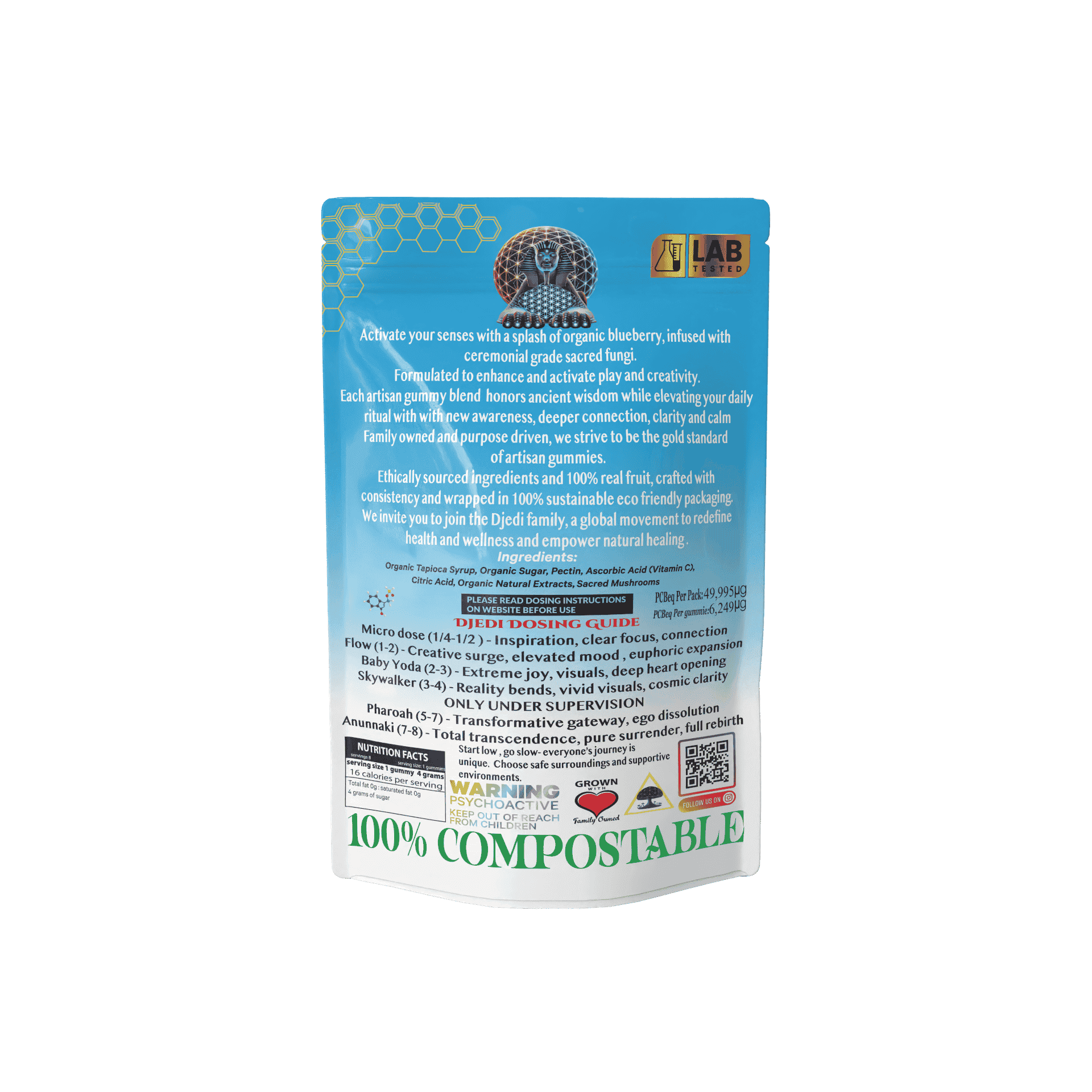 Our plant-based gummies are designed for those seeking more than just a snack. Infused with 4.5 grams of potent, sacred ingredients, they offer a unique blend of taste and transcendence. Whether you’re embracing a mindful lifestyle or looking for a sweet escape, these vegan blueberry gummies deliver a guilt-free indulgence.